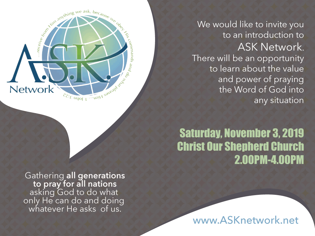 November 2, 2-4 PM at COSC. There will be an opportunity to learn about the value and power of praying the Word of God into any situation.